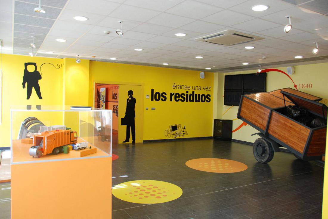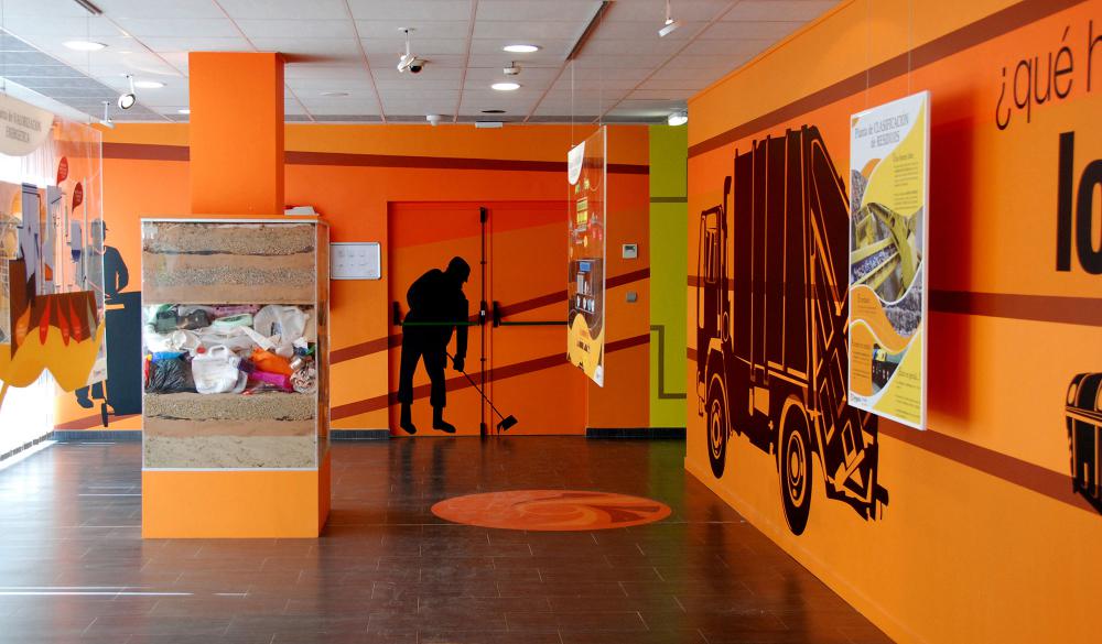 Diseñamos cada una de las diferentes estancias en torno a una temática y todas ellas siguiendo un orden relacionado con la evolución de la historia de la basura, desde la antigüedad hasta poner en valor la actual labor de recuperación de materias primas procedentes del reciclaje selectivo, que se realiza en el propio Centro de Tratamiento.