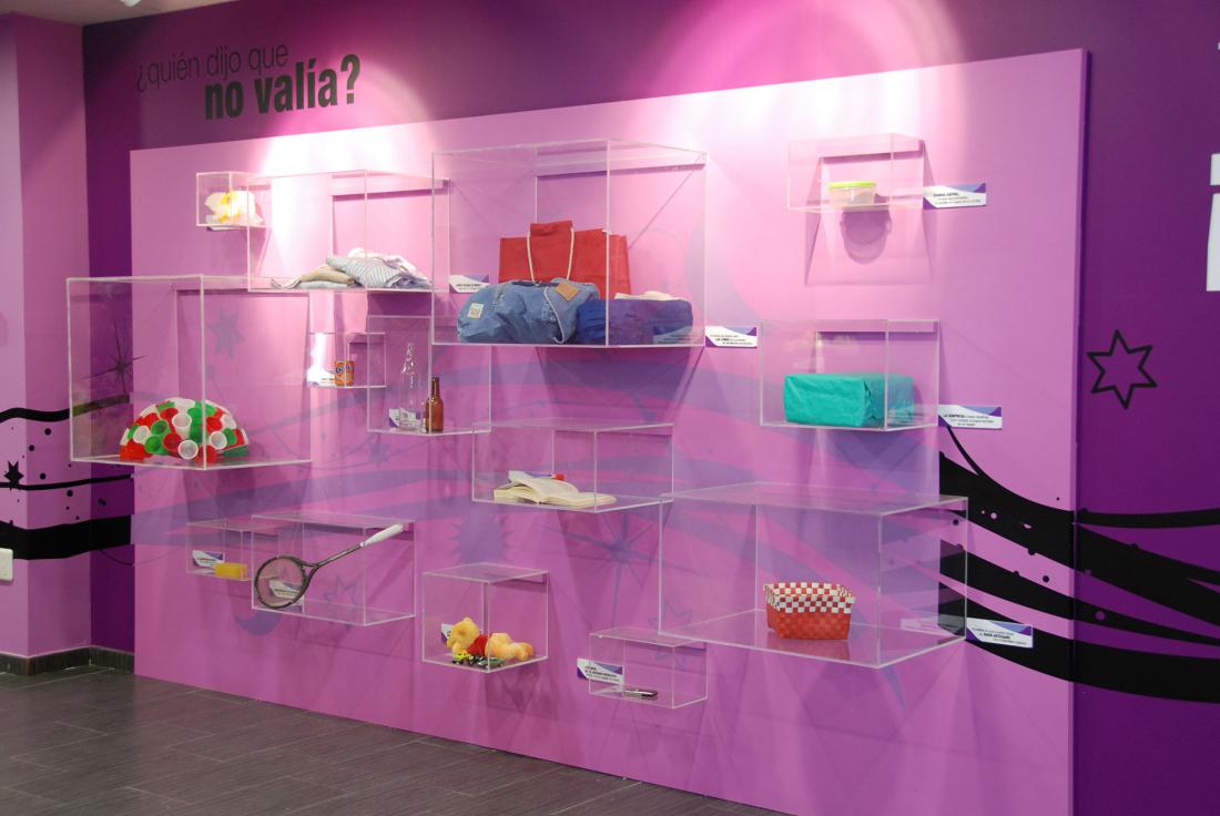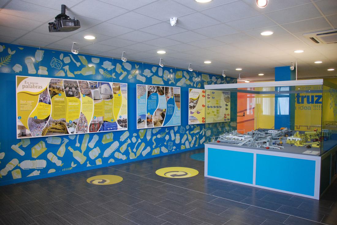 - Vitrinas con objetos reciclados y muestras representativas de residuos.