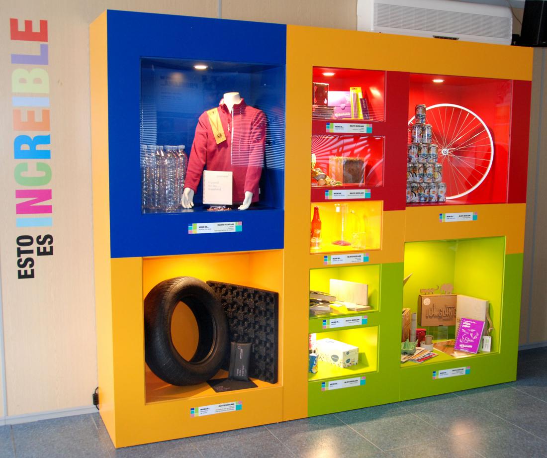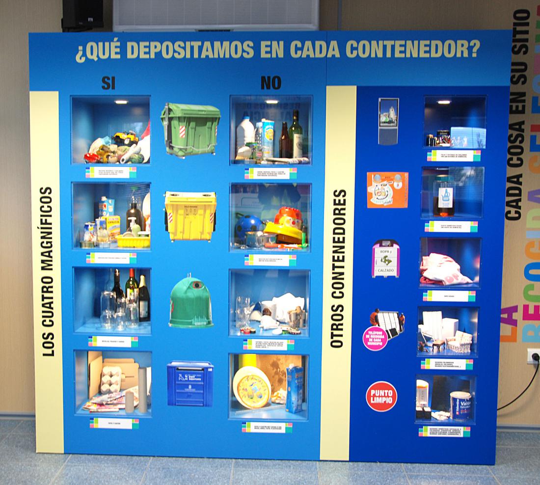El aula se acondicionó, por un lado, con vitrinas expositoras, donde se pueden observar objetos reales (tanto ejemplos de qué residuos se echan en cada contenedor como de objetos reciclados obtenidos a partir de los materiales clasificados). Por otro lado se elaboraron juegos y paneles explicativos (con la peculiaridad de que fueran enrollables, para recogerlos cuando el aula se destina a otros usos).